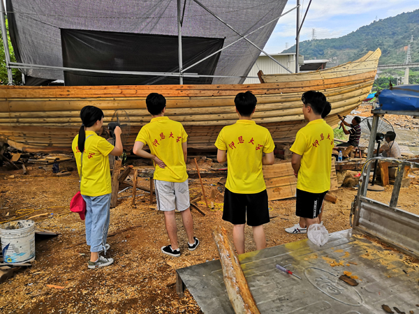 在向导的带领下,队员们依次参观了福船文化篇、福船技艺篇、民俗生活篇和传承保护篇等四个展厅。同时,队员们还前往水密隔舱福船制造地,近距离参观“福船”制造过程。一间摆满了木料的厂棚中,师傅们正在往船身缝隙里填上麻丝,再刷桐油上漆。队员们了解到该技艺在闽南已濒临失传,仅宁德市蕉城区漳湾镇刘氏家族中依旧传承保留。