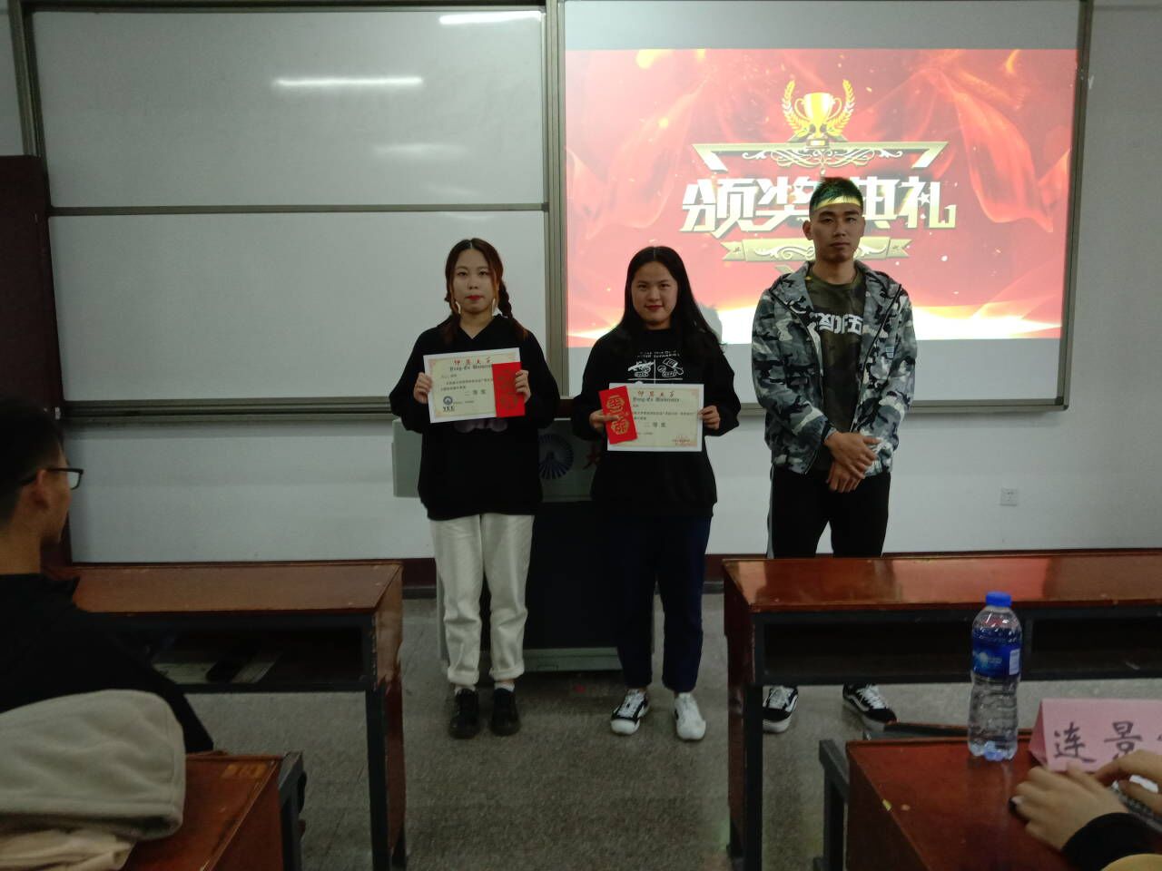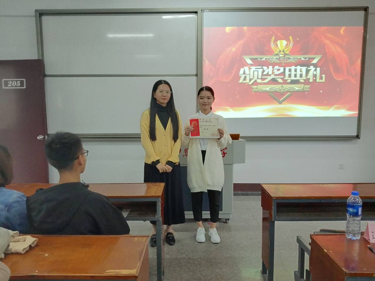 颁奖环节 比赛自12月2日启动以来,共历时16天,通过线下评委老师打分及线上投票,最终,张雪文、黄永祺荣获一等奖,郑彦宏、黄乐乐荣获二等奖,陈彦全、林心婷、傅峥晶荣获三等奖,郑彦宏荣获人气奖。活动现场,我院2019年国家奖学金获得者肖燕华分享了自己的大学经历,她号召学弟学妹们确定目标,不断向目标前进,成为自己想成为的人。最后,连景霞老师从“努力、自强、感恩”三个方面进行总结,教诲学生努力奋斗,学会感恩。