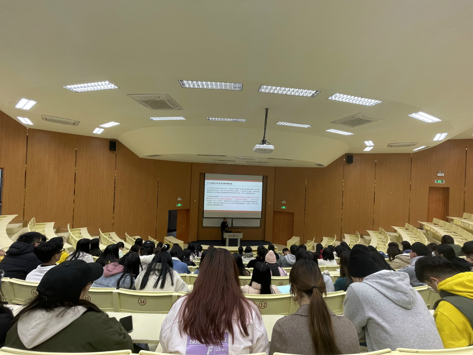 宣讲会现场 首先,十九届五中全会是在我国进入新的发展阶段,实现民族伟大复兴正处于一个关键时期召开的一次具有全局性、历史性意义的重要会议,明确提出了“十四五”时期我国发展的指导方针、主要目标、重点任务、重大举措、集中回答了新形势下实现什么样的发展、如何实现发展这个重大问题。唐老师强调我们要牢记此次会议的突出特点、亮点和五条原则,学习其深化供给侧结构改革的逻辑主线。其次,介绍了会议《公报》《建议》的主要内容总体上可分为总论部分、分论部分和结尾部分三大板块。再者,介绍了大会以全面把握新的发展阶段、全面贯彻新的发展理念、着力构建新的发展格局为核心要义。最后,唐老师呼吁全体党员必须坚持中国共产党的领导,学习、宣传、贯彻好党的十九届五中全会精神。