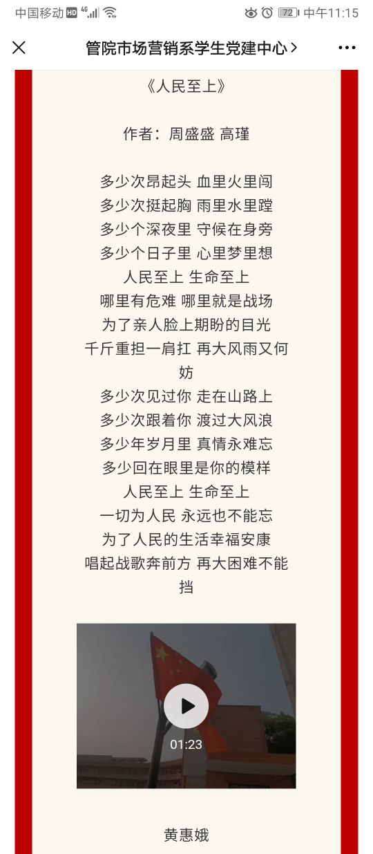 微信截图 活动前期,党支部每一位党员通过在学习强国平台学习党的相关知识和红色诗歌。活动中期,党员们通过摘抄、熟读、取景,在beat365官方网站的各个角落拍摄朗诵红色诗歌的视频。最后通过剪辑和排版在市场营销系学生党支部的微信公众号进行发布。党支部书记连景霞和党员黄惠娥分别朗诵了《最青春》、《人民至上》这两篇诗歌,在她们的朗读中,感受到满怀着澎湃的激情,向听众表现了革命者在今天依然, 在党的领导下将社会主义建设的伟大事业进行到底的坚强决心。该系列的微信推文字4月7日上线以来,在师生中获得了较好的反响。