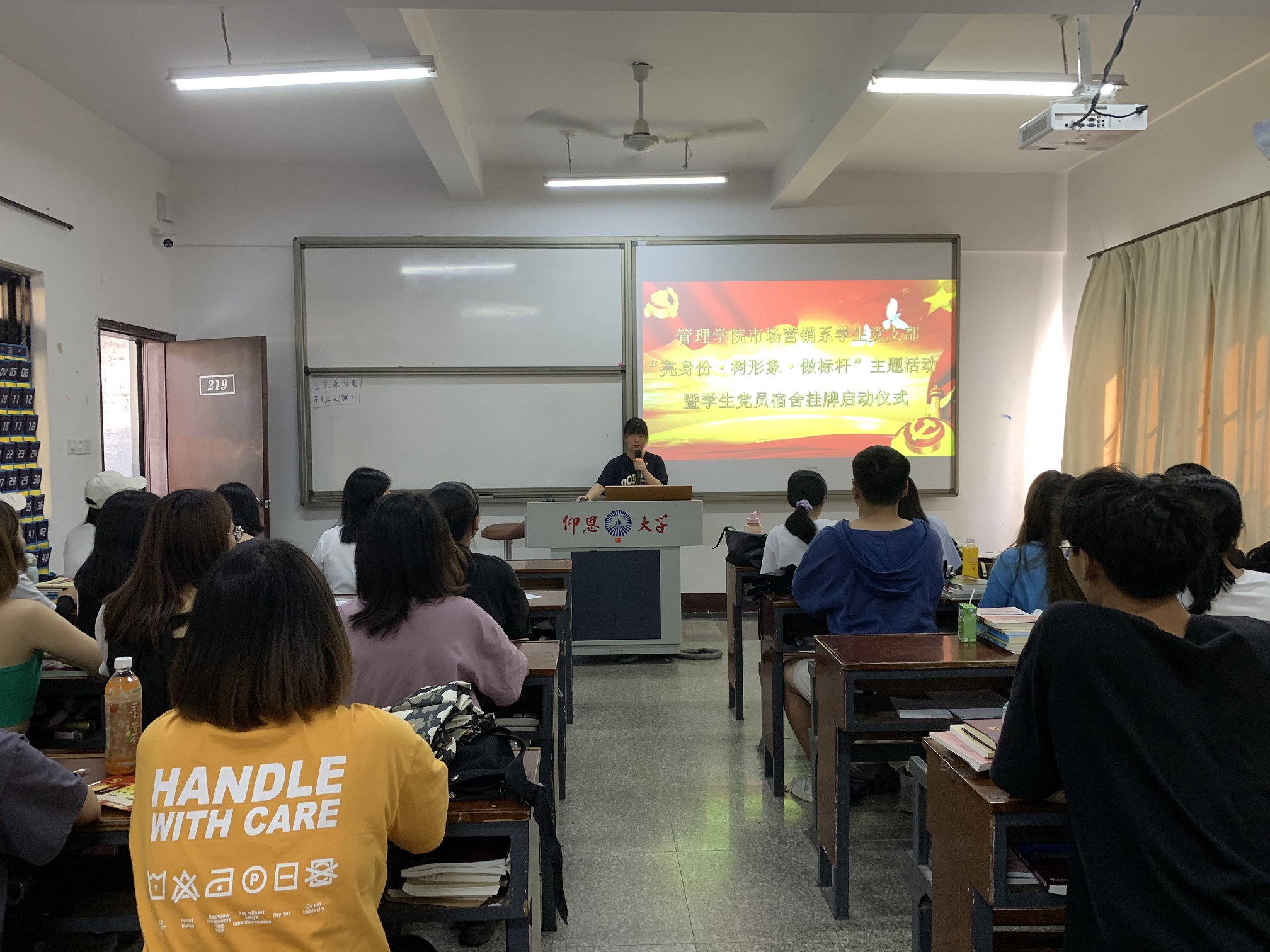 为进一步促进学院宿舍文化建设,发挥学生党员示范和榜样引领,6月17日下午,beat365官方网站市场营销系学生党支部在共和楼219开展“亮身份、树形象、做标杆”主题活动暨学生党员宿舍挂牌启动仪式。仪式由学生党员代表余凤凡主持。