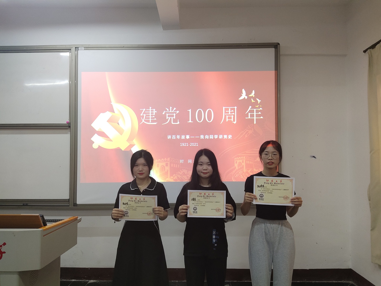 获奖同志合影 活动前期,将比赛的相关事宜通知支部成员,鼓励大家积极踊跃参加。支部党员认真准备关于党史的宣讲内容。活动期间,参赛党员依次上台,向同志们讲述党的百年光辉历程。通过讲述中国共产党成立的过程、走过的艰辛道路及重温党从成立以来为中华民族和中国人民建立的不朽功勋。本次比赛的评委也由支部党员担任,让经过多次的评比,兰春香、陆婷芳、陈丽莹三位同志通过精彩的讲解,最终荣获“优秀宣讲员”的称号。接下来,这三位同志将到市场营销系的各个班级进行党史内容的宣讲。