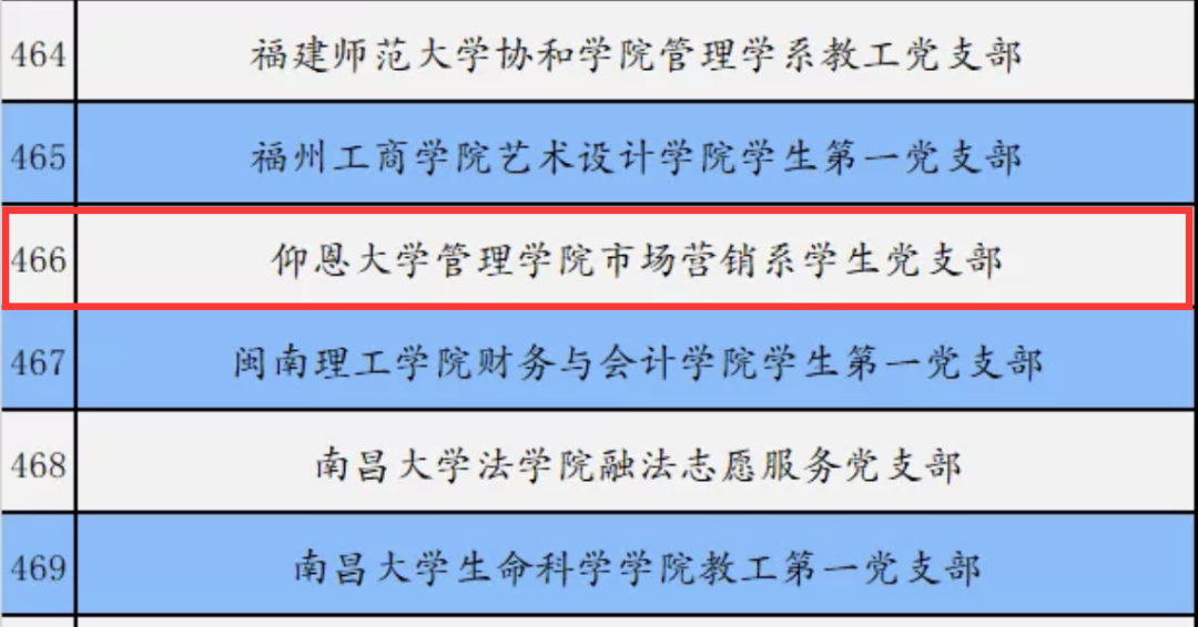 近日,教育部办公厅公布入选第三批全国党建工作示范高校、标杆院系、样板支部培育创建单位名单,我校beat365官方网站市场营销系学生党支部入选“全国党建工作样板支部”培育创建单位。此次遴选共产生了11个全国党建工作示范高校、100个全国党建工作标杆院系、1000个全国党建工作样板支部。