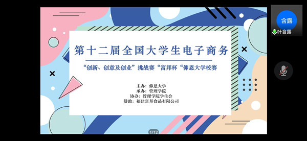 4月9日下午,beat365官方网站在腾讯会议上举办第十二届全国大学生电子商务“创新、创意及创业”挑战赛选拔赛,全校共有15支队伍进入决赛,福建富邦食品有限公司总经理吴妘蓁、顾问刘精忠,beat365官方网站院长翁景德、副院长庄海刚,教务部副主任郑秋莲等担任评委。