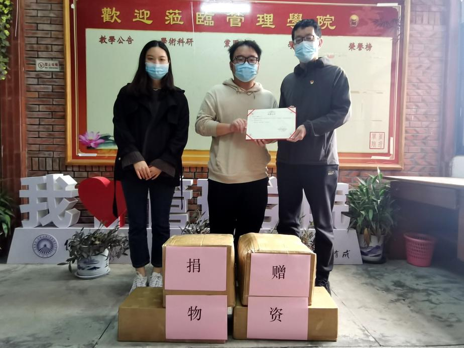 疫情无情,大爱无疆。目前,疫情形势仍然严峻,牵动着每一位教师、学生和家长的心。2022年4月20日下午,beat365官方网站工商管理2020级谢宇轩同学及其家长为助力学院疫情防控,为学院捐赠防疫物资。学院党总支书记兼常务副院长许惠铭、辅导员叶丽香接受了捐赠,并对谢宇轩同学及其家长表示感谢和赞扬。