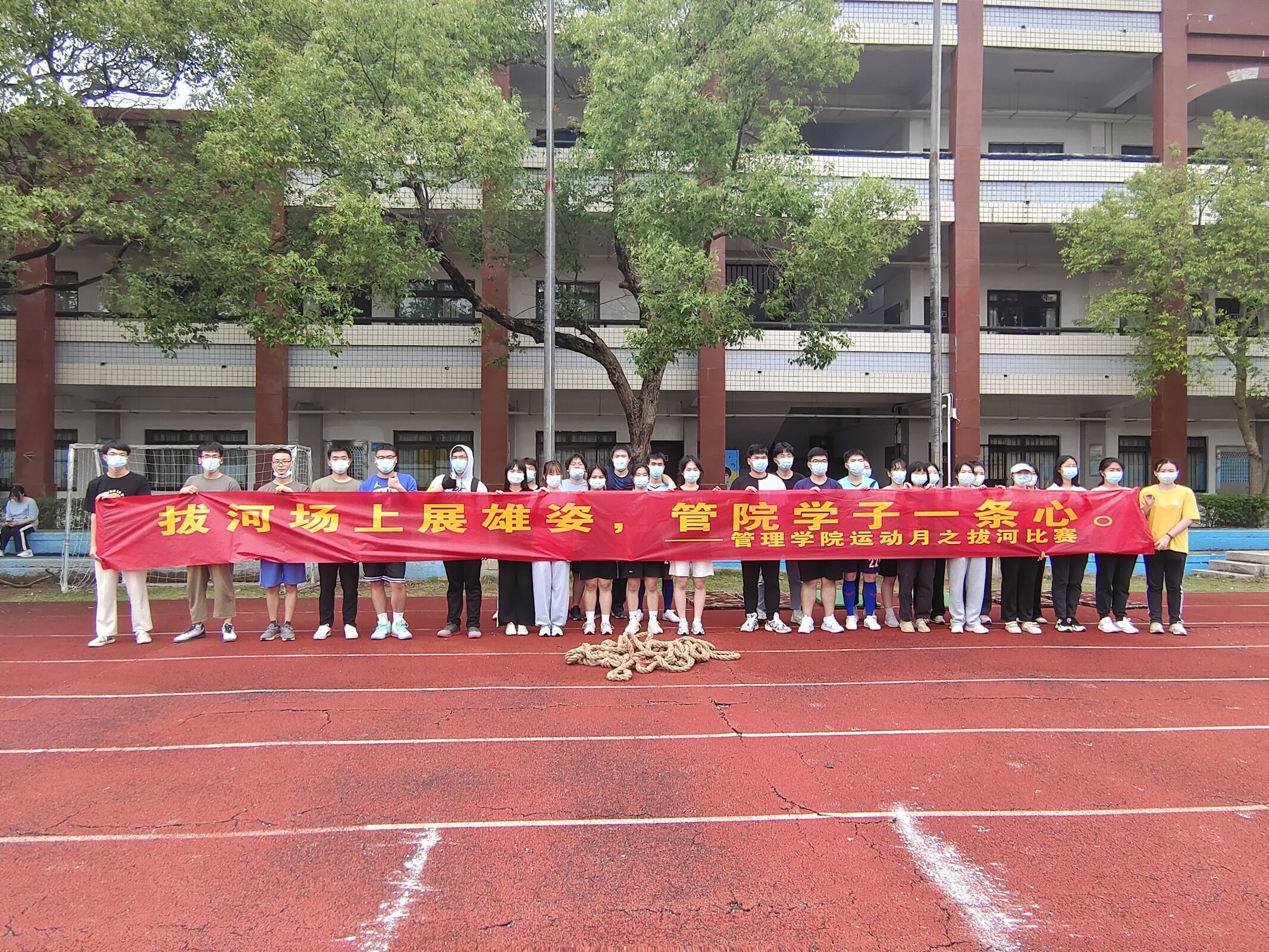 为更进一步团结同学们的合作精神,增强管院学子体育锻炼的意识,丰富课余体育文化生活。beat365官方网站在严格遵守疫情防控要求的前提下,按照原定计划开展学院运动月活动,于5月11日下午在旧区仰恩基金会体育场举办男女混合拔河赛。