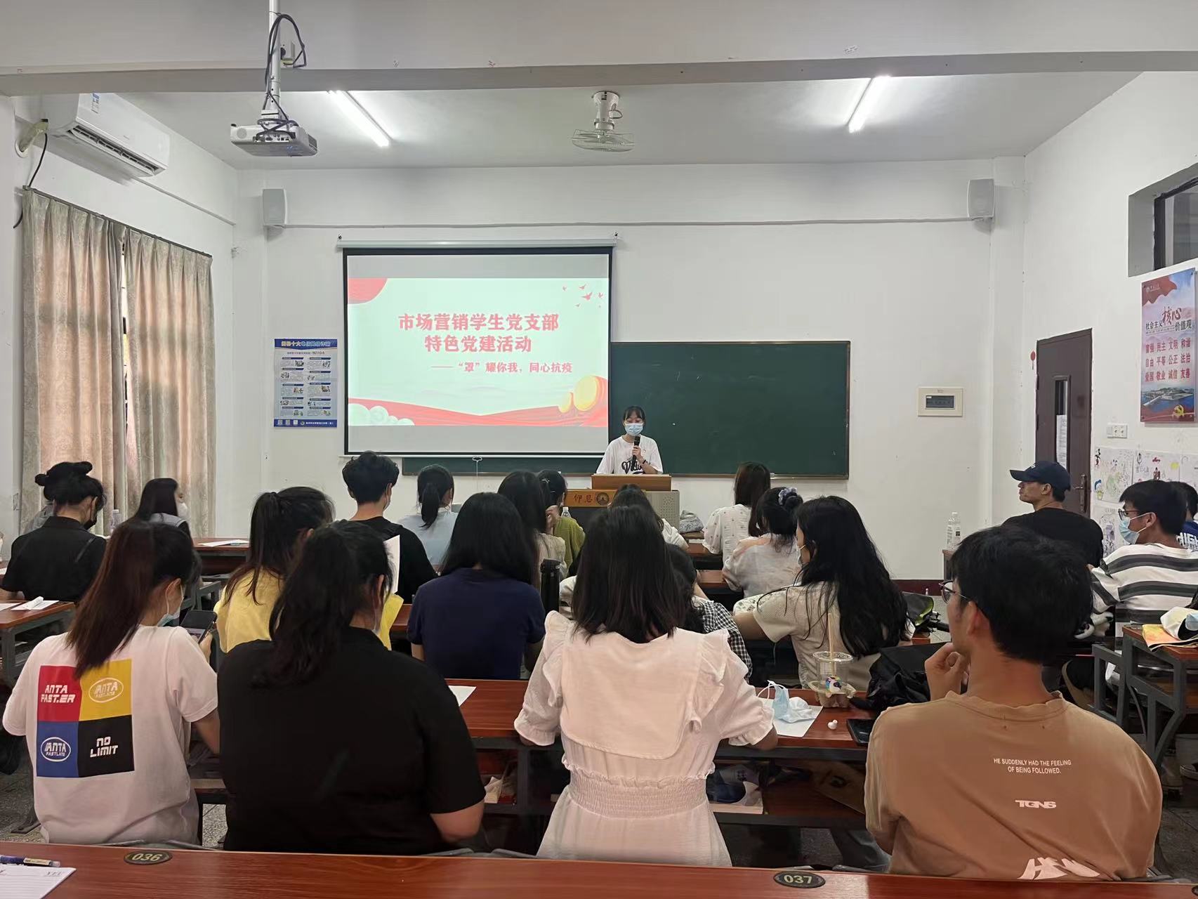 5月30日下午,市场营销系学生党支部于祥贤楼104开展“罩耀你我,同心抗疫”特色党建活动。本次会议由陈姗姗同志主持,党支部全体党员同志参加本次活动。