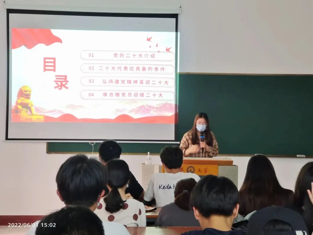 主持人介绍 为了进一步加强党支部建设,追忆革命历史丰碑,传承高尚革新精神,丰富党员政治生活,同时加强对同学们的思想教育。6月1日下午,物流管理系学生党支部在祥贤楼107教室开展“不忘初心跟党走,青春献礼二十大”主题活动。本次活动由黄淋丽同志主持,支部全体成员参加。