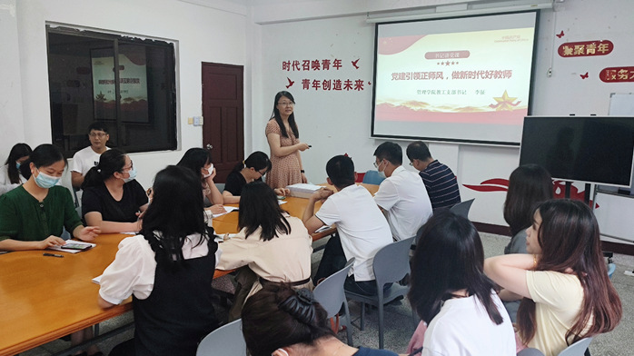 为深入贯彻落实“不忘初心,牢记使命”主题教育,6月14日,管理学院教工党支部在曼谷楼206会议室开展教工“支部书记讲党课”活动。教工党支部李征书记以《党建引领正师风,做新时代好教师》为主题,给全体教工党员上了一次专题党课。