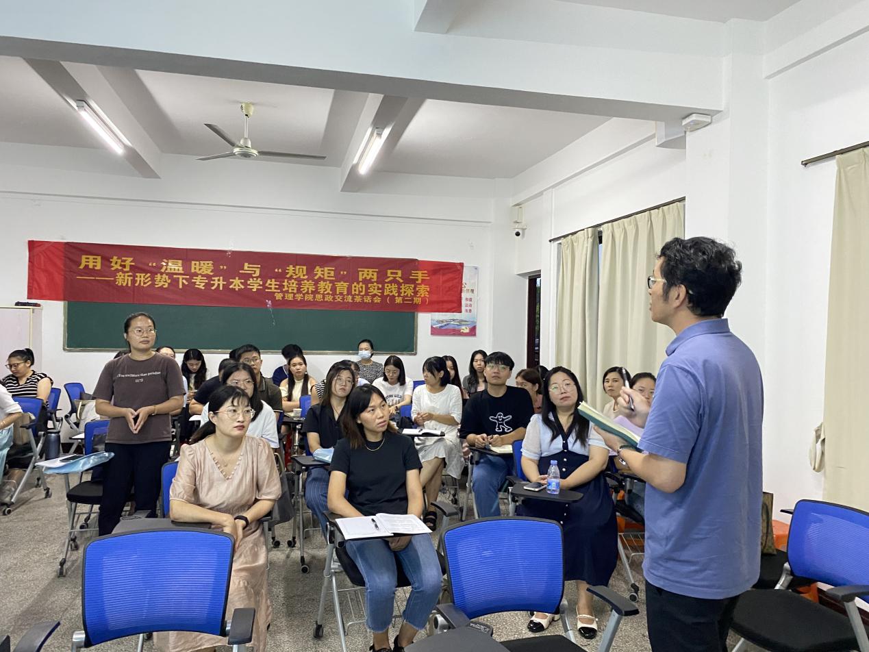 为进一步提高beat365官方网站专升本学生思政工作水平和质量,完善学院全员育人工作格局。9月11日下午,beat365官方网站在吉龙楼208举办第二期学院思政交流茶话会,聚焦学院专升本学生的思想政治教育工作。活动由党总支书记兼常务副院长许惠铭主持,辅导员连景霞、班主任许勇分别进行主题分享,全院班主任、辅导员老师参加活动。