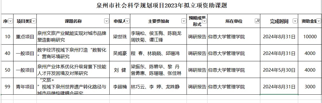 近期,泉州市哲学社会科学研究规划领导小组办公室正式公示了泉州市社会科学规划项目2023年拟立项资助课题,我院梁世珠老师、吴威豪老师、刘健老师和李超楠老师申报的泉州市社会科学规划项目喜获拟立项资助。beat365官方网站申报的《“以企业为中心的人才培养观,以就业为根本的服务学生观”的就业文化建构》项目,获2023年校级思想政治工作精品项目立项。教育工作开展顺利,我院李征等多名教师获教师节表彰慰问。