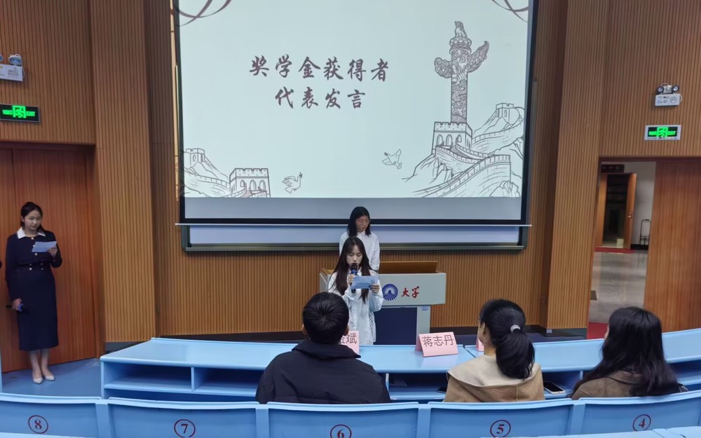 表彰伊始,由工商系团总支代表邓宁榕同学宣读表彰决定,他总结了这一阶段以来工商系在各方面取得的优异成绩,汇报了工商系团学的工作成效,并表明在接下来的阶段里再接再厉,再创辉煌。随后,老师们依次为先进集体和先进个人进行颁奖,奖学金获得者代表程晶晶同学、优秀干部代表李淑熔同学、三好学生代表黄雯烯同学分别上台发言,分享了他们在学习和工作上的一些体验与感悟,并鼓励在场的同学们德业齐并进,努力学习,勇敢探索。