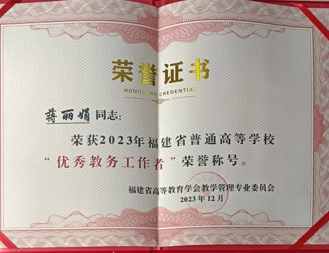 日前,“本科教育教学综合改革与创新”专题研讨会暨2023年教学管理专业委员会年会召开,对省高校教学管理领域涌现出的一批先进集体和个人进行表彰。我院蒋丽娟老师荣获“2023年度福建省普通高等学校优秀教务工作者”称号。