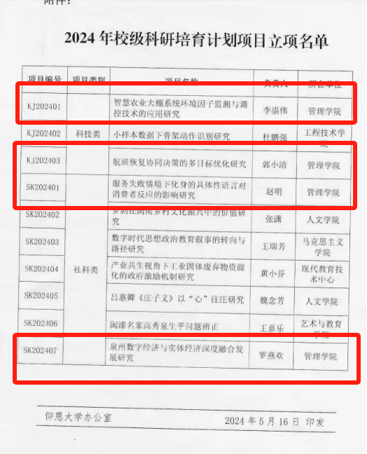 近日,经学校学术委员会评审,我院四位教师喜获2024年校级科研培育计划项目立项,其中科技类项目2项、社科类项目2项,具体情况如下: