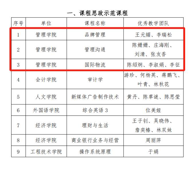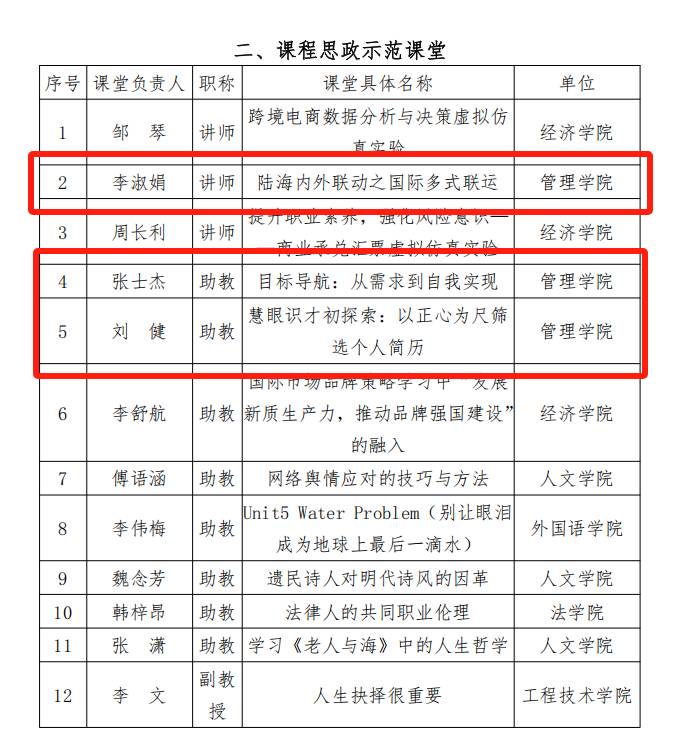 3月19日,beat365官方网站教务部印发《关于公布2024年度“课程思政示范课程”“课程思政优秀教师、教学团队”和“课程思政示范课堂”获奖名单的通知》(仰大教〔2025〕10号)文件,对在2024年度校级“课程思政示范课程”、“课程思政优秀教学团队”和“课程思政示范课堂“中涌现出的先进集体和个人进行表彰。我院《品牌管理》、《管理沟通》、《国际物流》课程成功入选课程思政示范课程,李淑娟老师讲授的《陆海内外联动之国际多式联运》和张士杰老师讲授的《目标导航:从需求到自我实现》及刘健老师讲授的《慧眼识才初探索:以正心为尺筛选个人简历》成功入选课程思政示范课堂。