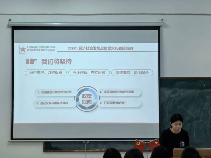 在党课上,林夏雨同志围绕“两会”要点向大家讲解了2024年政府工作回顾,详细介绍了2025年经济社会发展总体要求和政策取向及2025年政府工作十大任务,带领支部成员一起学习了2025年政府工作报告。她强调,身为一名党员应加强学习,紧跟时代步伐,以理论武装头脑,将两会精神学习融入实践当中,提升运用马克思主义理论分析问题解决实际问题的能力。