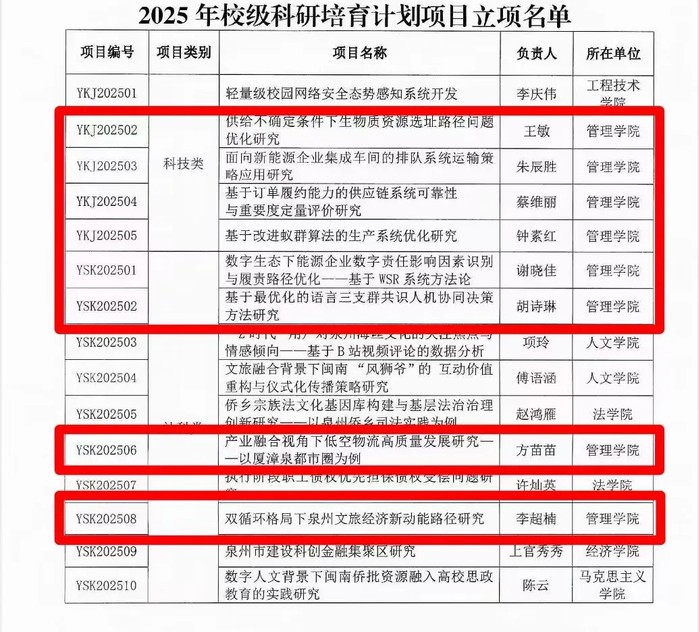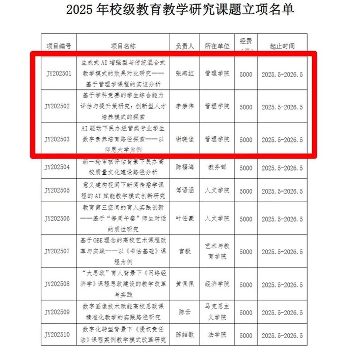 近期,根据《关于公布2025年校级科研培育计划项目立项名单的通知》(仰大研〔2025〕7号)、《关于公布2025年校级教育教学研究课题立项名单的通知》(仰大教〔2025〕19号),我院共立项校级科研培育计划项目8项,校级教育教学研究课题3项。