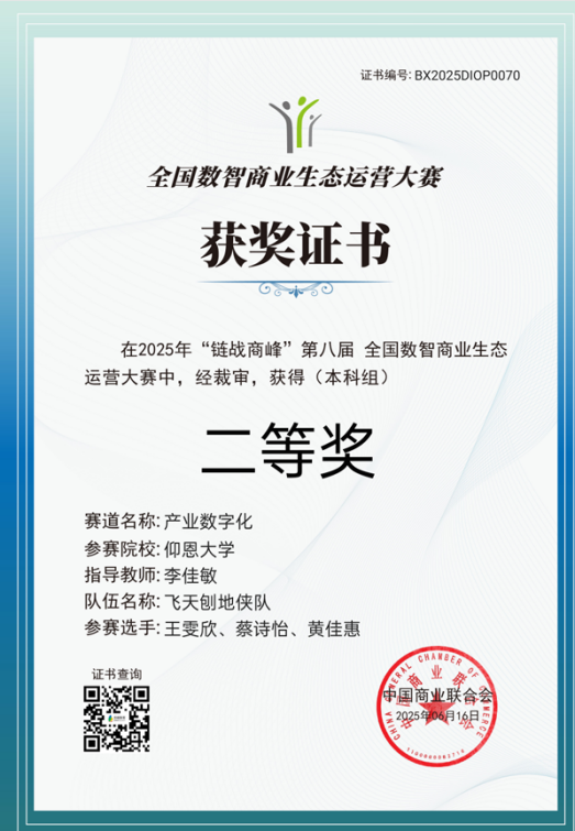 近日,第八届“链战商峰”全国数智商业生态运营大赛决赛圆满收官。本次大赛由中国商业联合会主办,上海百蝶教育科技有限公司提供技术支持,以“数智赋能商业,生态引领未来”为主题,吸引了来自31个省、自治区、直辖市434所院校的997支队伍踊跃参与,竞争异常激烈。最终,我院学子表现出色,在众多参赛队伍中脱颖而出,由张士杰和李崇伟老师指导的参赛队伍(成员为2022级工业工程吕莉欣、张慧娜、胡捷敏)以初赛和决赛均第一的成绩斩获了本科组产业数字化赛道团队国赛一等奖,由李佳敏老师指导的参赛队伍(成员为2022级市场营销王雯欣、蔡诗怡、黄佳惠)斩获了国赛决赛本科组产业数字化赛道团队二等奖的优异成绩。