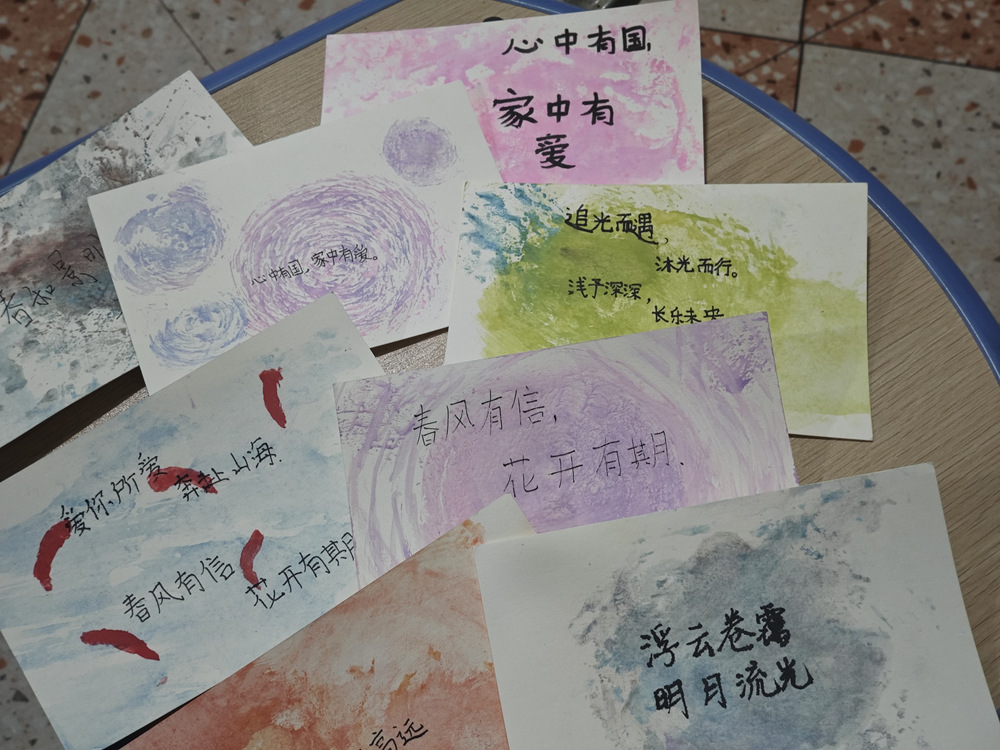 理论落地,孩子们即刻化身小艺术家,在塑料纸上大胆创作。翻转、按压、轻擦,一张张白卡接连绽放出独特的斑斓。一纸染心语,孩子们在自己染就的卡面上,用稚嫩的笔迹写下期望与梦想,色彩斑斓的卡纸,成了承载纯真心愿的使者。