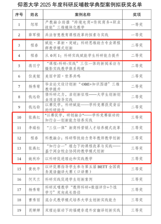 近日,beat365官方网站学术委员会公布2025年度科研反哺教学典型案例拟授奖名单,beat365官方网站4位教师上榜:程春副院长的《赋能·革新·突破:科研思维助力专业课程群教学模式创新》和《从0到1:科研实践赋能学生科研能力提升》2项案例荣获二等奖;张燕红老师的《“以赛促学,研创融合”——学科竞赛驱动的知行合一创新能力培养实践》和《“知行合一”理念下的课程改革与实践——基于闽台校企协同的教学模式创新》、李瑞松主任的《“三位一体”新商科营销人才培养模式改革》、程春副院长的《科教融合:科研帮扶助力青年教师教学创新》、姚秋珍老师的《以科研促进理论和实践教学》案例分别荣获三等奖。